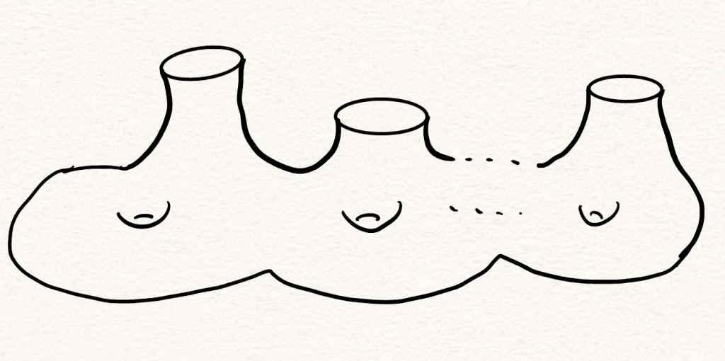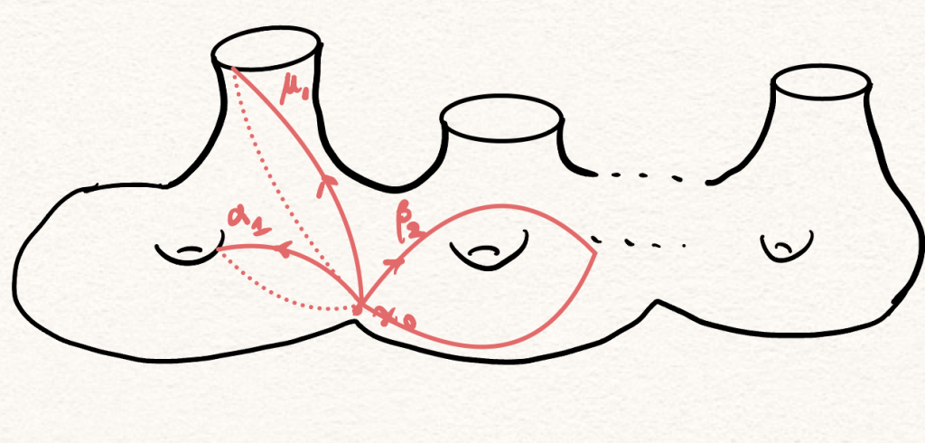 Recall that, the fundamental groups of Riemann surfaces have presentations in words. Let be the oriented loops which touch the boundaries,